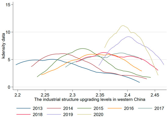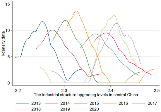 Observation by region: From Figure 6, the peak of the distribution curve shifted to the right, indicating that the level of industrial structure in eastern China generally showed an upward trend. An increase followed a decrease in the peak value of the main peak in volatility. According to the main peak width of the distribution curve, the main peak width first became larger and then smaller, indicating that the absolute difference in the level of industrial structure upgrading first became larger and then smaller. Moreover, there was only one main peak, indicating that there was no polarization in the eastern region. From Figure 7, it appears that the peak of the distribution curve for industrial structure upgrading generally moved to the right, indicating a general upward trend in the level of industrial structure upgrading in central China. In the central region, the industrial structure upgrading index first rose, then fell, and then rose again, with large fluctuations from the main peak of the distribution curve. As measured by the main peak width of the distribution curve, the main peak width first became smaller and then larger, indicating that the absolute gap first decreased and then increased; in 2016, a small wave peak was evident, indicating polarization in the central region. In Figure 8, it can be seen that the peak of the distribution curve generally moved to the right, indicating that the level of industrial structure upgrading generally rose in western China. The peak value of the peak of the distribution curve showed a trend of first rising, then falling, and then rising; the width of the main peak of the distribution curve continued to increase, indicating that the absolute gap was gradually increasing. In addition, there was only one main peak, indicating that there was no polarization.