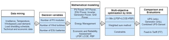 The methodology adopted to accomplish the proposed research is given in Figure 1. The HRES of the PV-WT-ESU-diesel generator system is considered to ensure uninterrupted power supply to a household community suffering scheduled load shedding from the grid. Assumed given are the load shedding schedules, the availability of the endogenous renewable resources, the load demand profile, as well as the relevant technical and economic characteristics of commercially available equipment (rated power, efficiency, and capital cost). The objective is the optimal design of the system that minimises, simultaneously, both the technical and economic objectives. The technical objective considered is the loss of power supply probability (LPSP), which reflects the reliability of the system. The economic objectives are described by two parameters: the levelised cost of electricity (LCOE) and the payback period (PBP), both calculated using life-cycle assessment. The optimisation is performed using a multi-objective GOA using the weighted sum method. Through the use of a weighting factor, which a priori expresses a trade-off between three objectives (LPSP, LCOE, and PBP), a multi-objective optimisation problem is reduced to a single objective and solved in a simplified way. Finally, the performance of the optimised HRES is compared with three conventional methods: diesel generator (only), UPS (only), and a combined generator-UPS system. The simulations are performed on Windows 10 Pro 64-bit Intel (R) Core (TM) i7-2600 CPU @ 3.40 GHz with 8 GB of RAM.