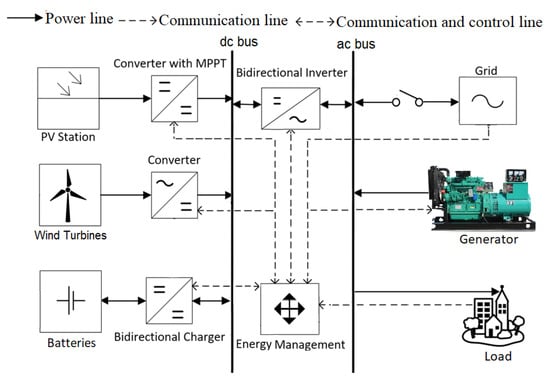 The proposed HRES of a multi-bus system is presented in Figure 2. The PV, WT, and ESU are connected to the DC bus, while the generator, grid, and load are directly connected to the AC bus. The PV array is connected by means of a unidirectional DC-DC converter with the maximum power point tracking control. The ESU, constructed from a lead-acid battery bank, is connected via a bidirectional DC-DC converter []. To maintain the power balance of the HRES, a central controller with an embedded EMS is used. The controller communicates with the power converters of various sources using control signal paths denoted by the dotted lines.