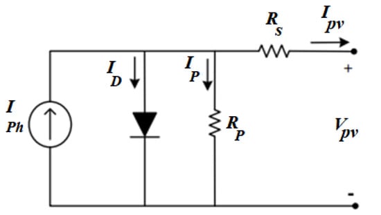 The power output of PV (P_PV) for any irradiance (G) and temperature (T) can be calculated using a single diode model, as shown in Figure 3 []. The output current of PV is given as: