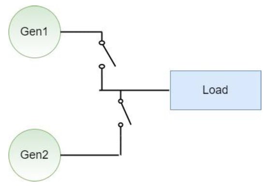 The main function of a diesel generator is as the secondary backup power source [], in case the primary backup (i.e., the ESU) is not able to support the load. In this work, a split two-generator system is proposed, as shown in Figure 4. The reason for using two generators is to allow the commitment of suitable generators to closely match the specific load demand. This is to avoid low operating efficiencies, thus minimising fuel consumption. Furthermore, this structure increases the reliability and redundancy of the system. The first generator, Gen1, is smaller (rated at 10 kW) than the second generator, Gen2 (20 kW). The sizes are chosen such that the simultaneous operation of both generators can satisfy the peak load of the intended system. However, the generators are turned on only if there is a need to cover the energy deficit during shedding intervals (i.e., when the PV, WT, and ESU are not able to satisfy the load requirement). The power produced by each generator can be described as: