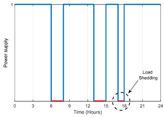 where BGrid (t) is a binary variable that describes the state of the grid at a specific hour. When BGrid (t) = 1, the grid power is available and when BGrid (t) = 0, the grid power is unavailable. Note that grid power can supply the load sufficiently whenever BGrid (t) = 1, Figure 5 demonstrates the status of the grid power supply with periodic load shedding intervals. The off state (depicted on the x-axis) reflects shedding durations. For this typical day, 5 h of load shedding can be observed.
