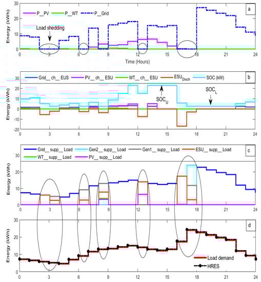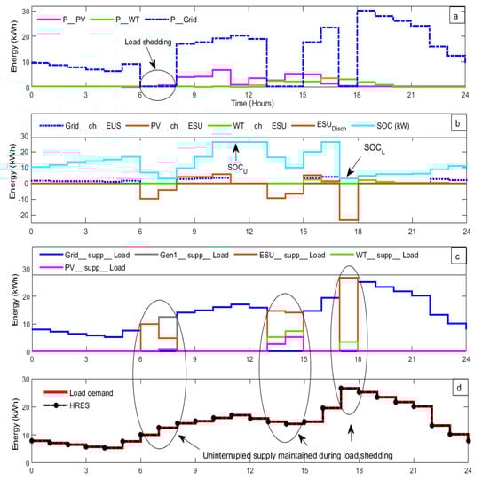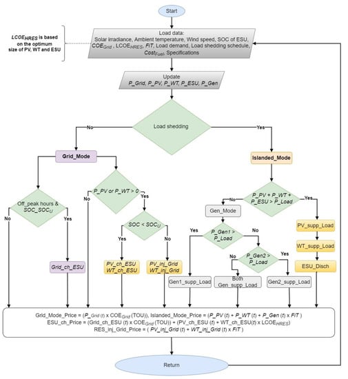 - Islanded mode: When the power from the utility grid is not available (load shedding duration). The HRES assets are utilised to meet the load requirement. Priority is given to PV and WT power. However, due to the intermittent and weather-dependent nature of these sources and the load variations, the ESU and generators can contribute to power supply operation. The EMS is developed using a rule-based algorithm and is shown in Figure 6.