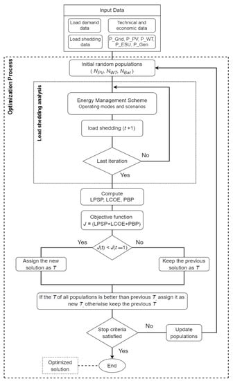 and the are the maximum and the minimum values of c, respectively. K represents the ongoing iteration, while kmax represents the maximum number of iterations. The position of a grasshopper is updated based on its current position, global best position, and the positions of other grasshoppers within the swarm. This helps the GOA to avoid being trapped in local optima. For this work, the GOA is employed to solve the sizing problem. The optimisation framework integrating the GOA (for optimal sizing) and the proposed EMS to address the load shedding problem is shown in Figure 7. At the start of the simulation, the GOA places some random particles from the search landscape whose limits are specified by the user (refer to Equation (21)). These particles move in the search landscape in accordance with the governing equations of the algorithm, thereby optimising the formulated objective function. The optimisation algorithm stops when it reaches the preset stopping criteria.