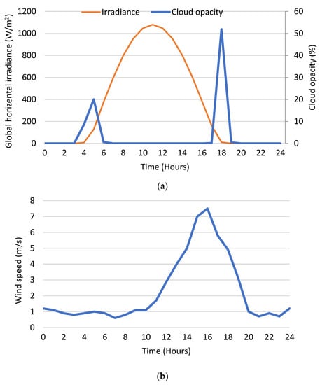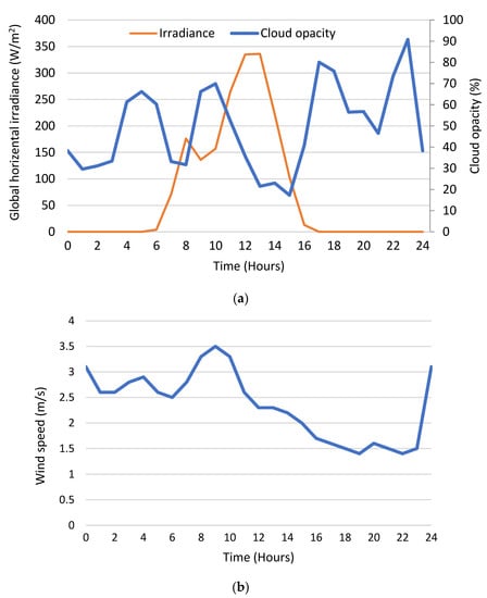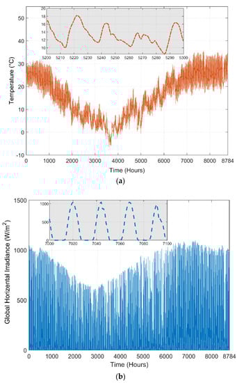 The proposed HRES is tested using a case study of a small residential community situated in Quetta City, a region in Baluchistan, Pakistan. The geographical location is identified with the latitude and longitude of 30.1798° N and 66.9750° E, respectively. Quetta and its surrounding districts have very poor electric power infrastructure; hence, the daily load shedding lasts several hours. On the other hand, Quetta has tremendous potential for indigenous renewables, particularly solar. The annual climatological data (i.e., solar irradiance, ambient temperature, and wind speed) are shown in Figure 8. The hourly data are sourced from Solcast (solar resource assessment and forecasting data), logged from August 2019 to August 2020 []. The mean value of daily irradiance is 5518 kWh/m2/day, while the mean ambient temperature (Tamb) is 26 °C. The mean wind speed (v) is 2.28 m/s at an anemometer height of 10 m. The data for G, v, and Tamb are plotted below, showing the hourly values during a year (8784 data).