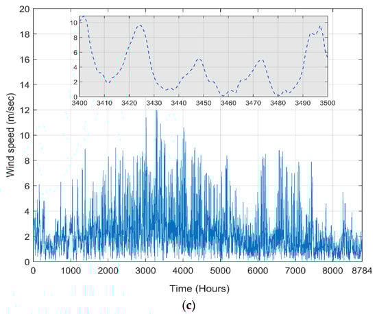 Annual climatological conditions of the studied site (Quetta): (a) hourly ambient temperature, (b) hourly solar irradiance, and (c) hourly wind speed.