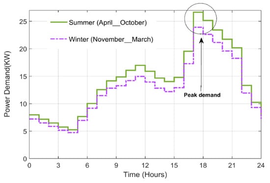Quetta is predominantly characterised by two seasons (i.e., summer and winter). The summer begins in April and ends in October with a maximum Tamb of 35.6 °C. Accordingly, the winter commences from November to March with a minimum Tamb of −6.4 °C. The load demand for the considered location (for 40 houses and limited public facilities) is shown in Figure 9 []. Two load profiles are considered: one for the summer season and the other for the winter season. Energy consumption during the summer is higher than in the winter due to the excessive use of air conditioning. The daily consumption for the given community is 345 and 309 kWh for summer and winter seasons, respectively. Accordingly, the peak power usage is 26.66 and 23.91 kW, respectively.