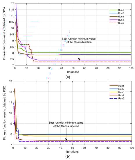 The optimization is achieved by minimizing the value of the fitness function given in Equation (19). As the fitness function is a multi-objective function that constitutes three variables, namely LPSP, LCOE, and PBP, each objective function is assigned an equal weightage of 0.33 to avoid the influence of any objective. The normalisation is performed as each objective function has different magnitudes than the others []. The normalisation process allows the fitness function to have the same magnitude for each contributing element during the computation phase. As the population-based algorithms are stochastically-based, getting a solution using a single run may not be conclusive []. To improve the reliability of the results, GOA and PSO algorithms are run separately across 5 individualistic runs with 100 iterations. The trend of fitness function convergence (with respect to iterations) for these two algorithms is given in Figure 10.