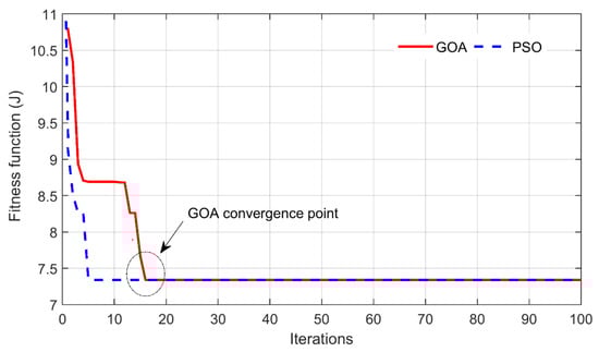 Since the optimisation objective is to minimise the multi-objective function, the runs with the lowest values represent the best solution. For the GOA, the red dashed curve in Figure 10a provides the best result. The obtained fitness function value () for this run is 7.34. In the case of PSO, the blue dashed curve in Figure 10b represents the best result. A comparison of the best curves of both algorithms is given in Figure 11. It was found that both algorithms converge at approximately the same fitness value (J = 7.34) leading to the same number of optimal components for PV, WT, and batteries to be installed. These results validate the accuracy and the reliability of the optimal sizing results. However, the PSO algorithm converges faster than the GOA, i.e., at the 5th iteration.