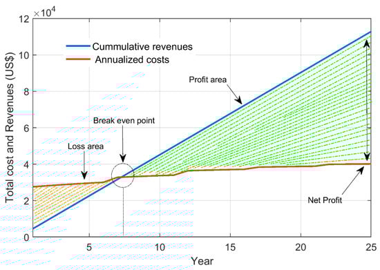 The economic assessment of the HRES is based on two well-known indicators, namely LCOE and PBP []. The LCOE determines the cost of electricity but does not consider the revenue opportunities. On the other hand, the PBP considers both the cost and revenue of the system. These indicators are crucial for comprehensive life-cycle analysis and economic feasibility evaluation of the project []. The LCOE is more related to consumers while the PBP is attributed to investors. The LCOE is defined as the total cost of the system over its warranted lifetime divided by the total energy production across the same period.