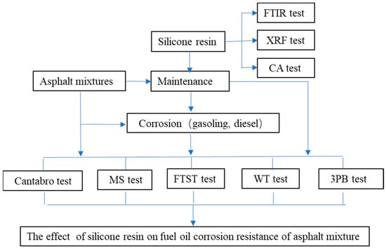 Existing works have mainly focused on the moisture resistance of silicone resin as the fog sealing material, but very few studies have focused on its oil-corrosion resistance. Therefore, this research intends to use FTIR and X-ray fluorescence spectrometer (XRF) to analyze the chemical composition of asphalt. Contact angle (CA), Cantabro test, Marshall stability (MS), freeze–thaw splitting test (FTST), wheel tracking (WT) test and three-point bending (3PB) test were used to investigate the corrosion of diesel and gasoline on the asphalt mixture and the effect of silicone resin on the fuel oil corrosion resistance of asphalt mixture. The experimental design of this paper is presented in Figure 1.