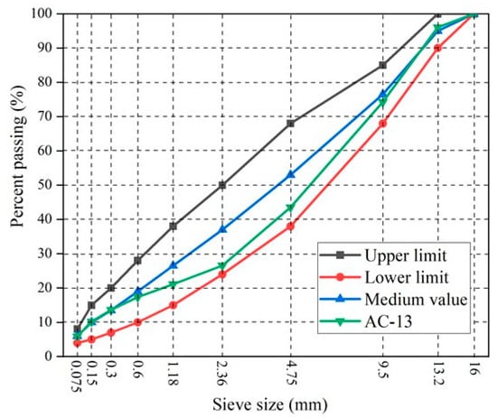 AC-13 asphalt mixture is the most widely used mixture type for the asphalt surface layer. The grading curve of the AC-13 asphalt mixture design is shown in Figure 2. The optimal asphalt content is 4.5% and the void ratio is 4.2%.