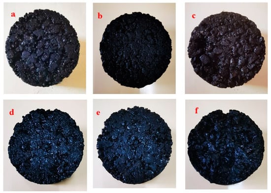 Images of asphalt mixture samples before and after oil corrosion (a) CS-RS, (b) CS-DC, (c) CS-GC; (d) SRTS-RS, (e) SRTS-DC, (f) SRTS-GC.