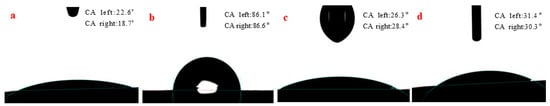 Contact angles between liquid silicone resin, water, gasoline and diesel and asphalt: (a) silicone, (b) water, (c) gasoline, (d) diesel.