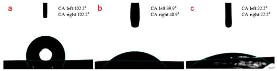 Contact angles between water, gasoline, and diesel and solid silicone: (a) water, (b) gasoline, (c) diesel.