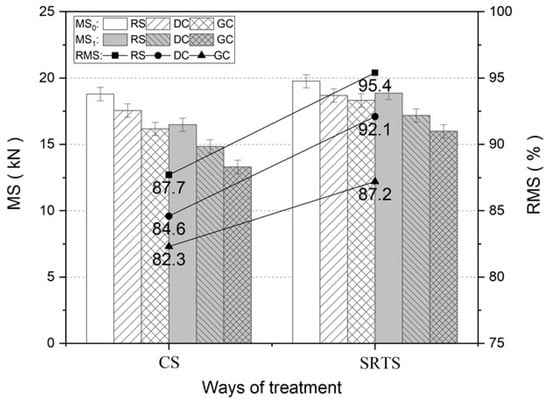 The Marshall stability test and freeze–thaw splitting test results are shown in Figure 9 and Figure 10. As shown in Figure 9, the Marshall stability of asphalt mixture decreases due to oil erosion, but it is still greater than the requirement of ≥8 kN proposed in JTG F40-2004. Silicone resin treatment can improve the Marshall stability and immersion Marshall stability of asphalt mixture before and after oil etching, and the effect of enhancing the immersion Marshall stability is greater, so as to improve the residual Marshall stability of asphalt mixture before and after oil etching. The Marshall stability reflects the strength of asphalt mixture, the residual Marshall stability reflects the water stability and the Marshall stability and the residual Marshall stability after oil erosion reflect the ability of asphalt mixture to resist oil erosion. Therefore, the Marshall test results show that oil corrosion reduces the strength and water stability of asphalt mixture, and silicone resin cannot only improve the strength of asphalt mixture, but also improve the water stability and oil corrosion resistance of asphalt mixture.