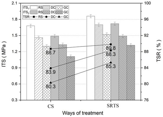 where MS0 and MS1 are Marshall stabilities before and after moisture damage, kN; ITS1 and ITS2 are indirect tensile strengths before and after freeze–thaw cycles, MPa, respectively.