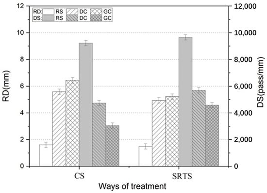 The influence of silicone resin and oil corrosion on the high temperature performance of asphalt mixture was characterized by the wheel tracking test, which was conducted according to T0719 in JTG E20-2011 [34]. The test temperature was 60 °C, the load was 0.7 MPa, and the rolling speed was 42 times/min. Dynamic stability is calculated according to Equation (4):