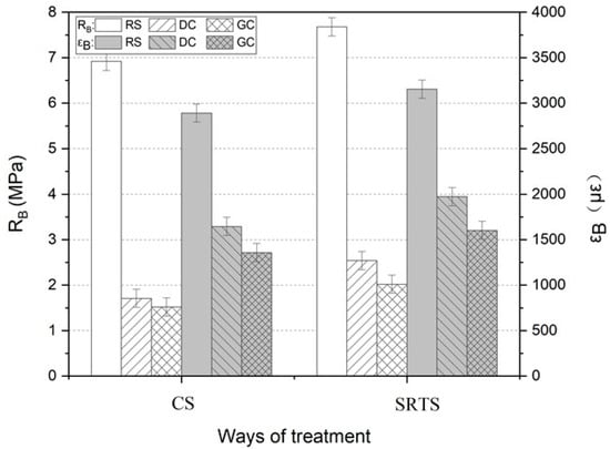 The influence of silicone resin and oil corrosion on the low-temperature performance of asphalt mixture was characterized by three-point bending test, which was conducted according to T0715 in JTG E20-2011 [34]. The test temperature was −10 °C, the loading rate was 50 mm/min and the size of the specimen was 250 mm × 30 mm × 35 mm. Failure flexural tensile strength (RB) and strain (εB) are calculated according to Equations (5) and (6):
