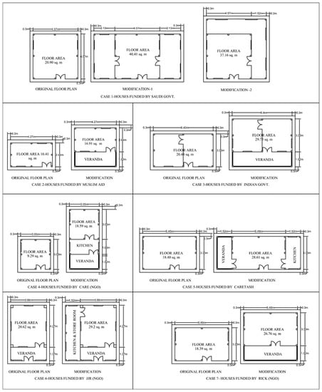As part of the reconnaissance survey, it was the first step to find out how many donor organizations contributed to the PDHR program, and after doing so, it was discovered that a total of seven donor organizations played a role in the reconstruction program: Muslim Aid, the Saudi Government, the Indian Government, JJR, RICK, CARE, and the Bangladesh Government. In the area where the survey was conducted, there were around six hundred houses that had been reconstructed, the majority of which were in a modified form. As a response of this reality, a retrospective survey was selected as the second step to identify the original plans for the donor-driven houses, and the Figure 2 depicts the original and modified forms of the houses. As a third part, forty modified houses belonged to each donor organization, plus an additional 12 houses, so that in total, 292 modified houses were selected for a questionnaire survey to determine the reasons behind the modifications. Many of the victims of this area expressed their dissatisfaction with the area’s planning and construction concerns, including the lack of a veranda or kitchen, insufficient sanitation facilities, low-quality construction materials, and the extremely low involvement of victims in construction work. Finally, a key informant survey was conducted with the people who were directly involved in the reconstruction works, such as government and non-governmental organizations officials, engineers, contractors, and local representatives, and they were enquired about the PDHR housing reconstruction strategy, their own personal thoughts on the way of modifications and suggestions regarding resilient housing.