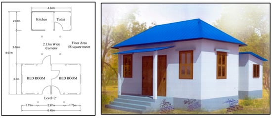 As part of desktop survey, the initiative regarding disaster housing taken by the Ministry of Disaster management and Relief in Bangladesh in 2019 is analysed. Figure 3 reveals the completed layout and 3-D modelling of that house, with an estimated cost of BDT 260,000 BDT or USD 2736 for each housing [59]. The house’s total covered area is approximately 58 sqm (square meter) or 631 sqft (square feet), and the floor area is 40 sqm or 431 sqft, however considering the overall size, the proposed plan may have the potential to develop it in various ways. First and foremost, expanding the room size and assuring the privacy of the households since these types of disaster houses are mostly for rural communities, and these people have a fundamental desire for spacious rooms covering the least amount of space while maintaining complete seclusion. Another significant issue is the absence of a veranda, which is a prerequisite of rural housing. Finally, an attached toilet and kitchen may be the appropriate solution for rural populations, particularly for rural women and the elderly, because it will not only allow them to accomplish their daily activities without facing any complications or difficulties, but it will also assist to minimize overall enclosing area and cost. On the other hand, the Housing and Building Research Institute is another entity dealing with disaster housing in Bangladesh. This institute proposed several sizes of houses ranging from 11 sqm to 21 sqm or 120 sqft to 230 sqft [60], which are basically one-room houses and that is too small according to the demand of the disaster affected community of Bangladesh.