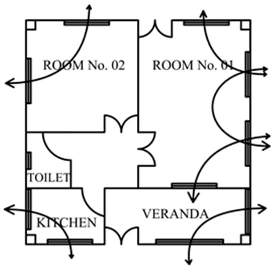 Generally, indoor environments require ventilation to maintain the essential quantities of oxygen and air quality. In addition, the positioning of apertures for the entry and exit of air is essential for the successful guiding of air currents, which is necessary for enough ventilation to be maintained. Good thermal comfort can be achieved by increasing air speed through cross ventilation, which encourages evaporative cooling of moist skin and larger the opening area in the cross ventilation routes the greater the expected amount of cross ventilation as well as saving in energy (Figure 6). However, most of the conventional donor driven houses have poor ventilation facilities that lead thermal discomfort to the victims. In view of the aforementioned discussion and the victims’ demand for proper ventilation, cross-ventilation facilities that correspond to the total ten number of windows are provided for the resilient housing plan