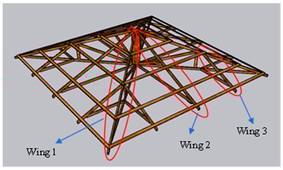 A hip frame is preferable to a gable frame when it comes to constructing a roof since it has an inward slope on all four sides, which strengthens the structure’s façade while also increasing its resistance to wind and precipitation. Uplift pressure, which is a primary cause of roof collapse, is minimized when the roof slope is between 20° to 30° [66]. Since wood has more benefits than steel when it comes to roof framing, a 27ʰ sloped wooden hip frame roof (Figure 10) is a sensible choice. One central 150 mm × 150 mm × 1.5 m column, three types of wings, and four purlins per side make up the proposed wooden hip frame roof, which is shown in the accompanying image with its detailed dimensioning presented in Table 2. Moreover, more than 85% of the donor-driven houses in the survey area had no ceilings, which made it impossible to lead a normal life during the sweltering heat of the summer. In response to the demand of the victims, bamboo mats measuring 3 m by 3 m are suggested as a ceiling material because of their ability to maintain a comfortable room temperature while also serving as a storage space. Additionally, corrugated iron (CI) of thickness 6 mm will also be employed as a roof covering material due to its affordability, availability, light weight, and durability.