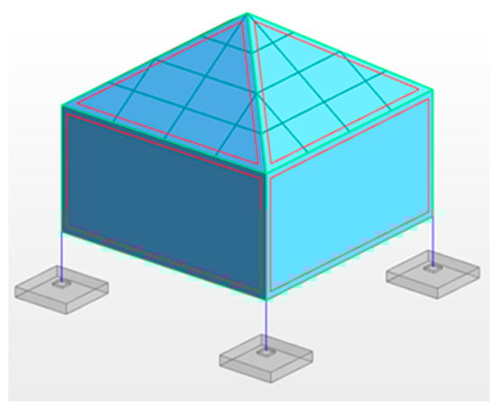 The Autodesk Robot Structural Analysis 2021 software was used for numerical analysis [71]. Finite Element Model (FEM) was taken into account the proposed resilient house of 6 m in length and width, with 1.2 m sub-structure column length and 3 m superstructure column length, with a height of 3 m for the walls and 1.50 m at the top of the roof from the wall is depicted in the Figure 12, equivalent to category I house [72]. Some assumptions were made while conducting this modelling. These are: (i) It was assumed that all of the truss’s joints were pinned, even if they didn’t exhibit any specific pinned behaviour, similar condition for the joint between the column and the truss, the column and beam, and the beam to beam.; (ii) When a wall connects with a column and beam it is considered to be continuous (displacements at the junction or common node are supposed to be the same for wall, column, and beam components), even when the materials are different; (iii) The roof’s slope was considered in such a manner that suction pressure would act on the whole roof; and (iv) All motions along the three global axes were considered to be zero at the bottom of columns.