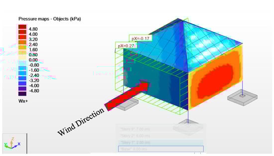 The maximum displacement in the global x- (horizontal), y- (horizontal), and z- (vertical) directions determined by finite element analysis (FEA) due to the application of wind load (Figure 13) was found to be 1 mm, 11 mm, and 3 mm, respectively, using the software stated above. There was maximum displacement in the exterior wall in both x and y directions, as well as in the roof top level, in the z direction. As specified by the International Building Code 2018 (IBC), exterior walls with other fragile finishes, as well as roof members supporting non-plaster ceilings, have a maximum permitted displacement of l/240, where l is the clear span length [73]. As a consequence, the exterior wall and roof may have a maximum displacement of 25 mm, which is in line with the results achieved for the proposed resilient housing model. In addition, determining the lateral deflection and drift is vital because of the three ways in which movement may affect a structure: structural components (such as beams and columns); non-structural elements (such as windows and walls) and adjacent structures [74]. Overall drift in the proposed housing is zero in the FEA owing to the high stiffness of the sub-structure RCC part but for performing study of the only super-structure part it was revealed 16mm that meets the IBC limit. As maximum drift for normal buildings according to IBC is between 0.7% and 2.5% of storey height, that means the drift limit will be 21 mm to 75 mm.