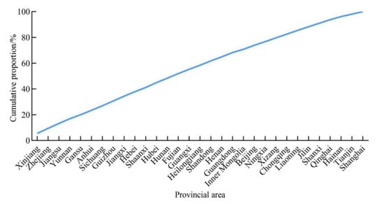 The disequilibrium index is an index reflecting the distribution of point-like elements, which can be used to analyze the balanced distribution of key rural tourism villages in various provinces and regions in China. In addition, the Lorenz curve was introduced in this paper to further reflect the imbalance of key villages. The Lorenz curve represents the cumulative proportion of variables and ranks them from low to high [52]. The calculation formula is as follows: