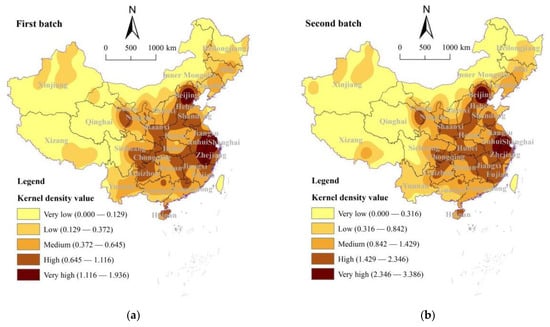 Thirty-one provincial-level administrative regions in China (excluding Hong Kong, Macao, and Taiwan) were taken as the scope for analysis. Meanwhile, ArcGIS10.5 software was used to analyze the kernel density of the first, second, and third batches of rural tourism key villages and all three batches of villages. Based on previous studies, Jenks’s natural discontinuity classification method [61] was used to set the same parameters for analysis according to the ArcGIS10.5 software. According to the size of the kernel density value, the region was divided into very low-density area, low-density area, medium-density area, high-density area, and very high-density area. However, the size of the kernel density value presented by each batch is not the same. It can explain in more detail which interval the kernel density value is in and compare the differences of three groups of key rural tourism villages more clearly. The spatial distribution density map of rural tourism key villages is shown in Figure 3, revealing that it varies significantly in different regions in China.