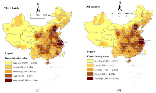 Figure 3. Kernel density diagrams of the spatial distribution of key rural tourism villages in China. (a) Kernel density diagrams of the spatial distribution of the first batch of key rural tourism villages in China. (b) Kernel density diagrams of the spatial distribution of the second batch of key rural tourism villages in China. (c) Kernel density diagrams of the spatial distribution of the third batch of key rural tourism villages in China. (d) Kernel density diagrams of the spatial distribution of all batches of key rural tourism villages in China.