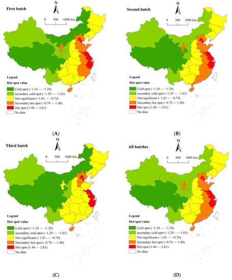 The hot spots of the first batch of key rural tourism villages were mainly distributed in Beijing, Tianjin, Jiangsu, Zhejiang, and Shanghai, while the sub-hot spots were distributed in Hebei, Shandong, Anhui, Jiangxi, Fujian, Hainan, and Ningxia. The sub-cold spots were in Shaanxi, Gansu, and Xinjiang. The cold spot areas were in the Qinghai–Tibet Plateau, the Sichuan Basin, and the Inner Mongolia Autonomous Region. The hot spots of the second batch of key rural tourism villages were consistent with those of the first batch. The sub-hot areas were basically stable, and Guangdong Province became a sub-hot area. Gansu Province in the sub-cold spot area was changed to the cold spot areas. The hot spots of the third batch of rural tourism key villages were consistent with those of the first two batches, in addition to Gansu Province in the sub-cold spot area changing to the cold spot areas. Moreover, the Inner Mongolia Autonomous Region was transformed into a cold spot area. According to the total amount of three batches of key rural tourism villages, the hot spots were concentrated in the Beijing–Tianjin region and Yangtze River Delta region, while the cold spots were mostly concentrated in the Qinghai–Tibet Plateau and the Sichuan Basin.