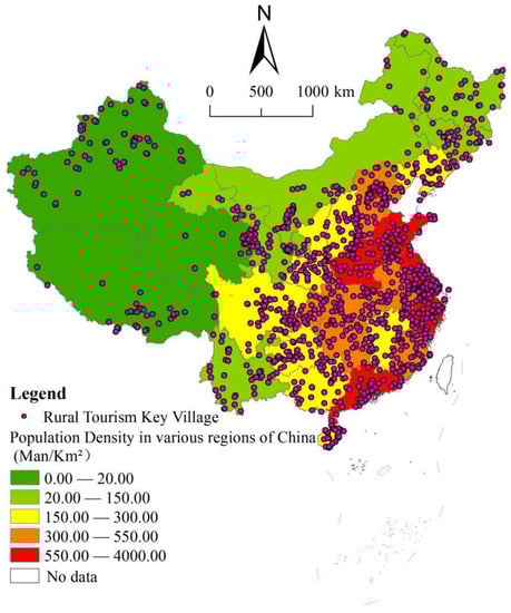 Population density is one of the main factors affecting the spatial distribution of key rural tourism villages. The larger the population density, the larger the tourism market capacity and the potential tourism market [69]. Population density is the number of people per unit of land area. High-density population gathering in economically developed areas, to a certain extent, determines the development and construction of key tourism villages, which has a significant radiation and driving effect on the development of surrounding villages. In Figure 8, because of the high population density, good economic foundation, and high degree of modernization, the key rural tourism villages were mainly distributed in the east area of the Hu Huanyong Line, especially in the eastern coastal areas. This caused the agglomeration effect of key tourism villages. Due to the large land area, sparse distribution of tourism villages, small population and fragile ecological environment of the remote areas of Xinjiang, Inner Mongolia, Tibet, and other provinces, the key rural tourism villages were sparsely distributed, accounting for a relatively low proportion.