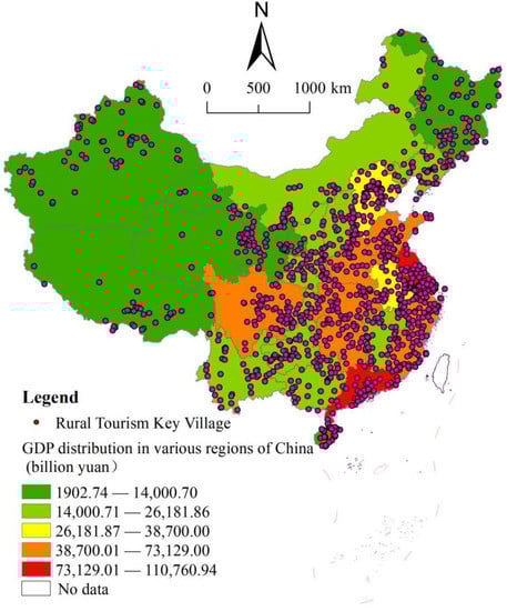 The level of regional economic development determines the distribution, development, and construction of key rural tourism villages. The GDP of each region in 2020 with the number of key rural tourism villages was combined for overlaying analysis (Figure 9). The results show that the GDP of Guangdong, Jiangsu, Shandong, Zhejiang, and other eastern coastal provinces and the number of key rural tourism villages were at the forefront. There was a positive correlation between the level of economic development and the distribution of key rural tourism villages in these provinces.