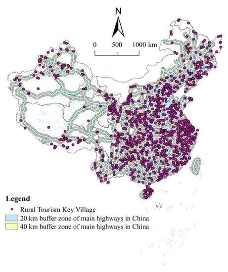 Transportation is one of the six elements of tourism linking tourism destinations and tourist sources, including railways, highways, aviation, and water transport [70]. The source market of rural tourism is mainly the surrounding cities facing self-driving tours. Thus, the distribution of key rural tourism villages was affected by road traffic factors. Referring to the standard of tourists’ strong sense of experience, the buffer radius is 20 km and 40 km, respectively, and tourists can ride and drive to the main road within one hour [71]. As shown in Figure 10, the 20 km buffer zone of the main highway traffic line covered 746 key rural tourism villages (62.2%), and the 40 km buffer zone covered 1014 key rural tourism villages (84.6%). This indicates that the traffic location conditions had a significant impact on the spatial distribution of key villages of rural tourism. Therefore, the development degree and time sequence of rural tourism along traffic roads were constantly improving and optimizing, which further promoted the agglomeration development of key rural tourism villages along traffic routes.