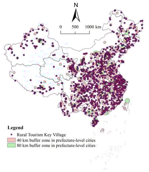 In recent years, with the rapid development of rural tourism, the public has been glad to choose the short, frequent, and fast way of vacation. Rural tourism has become an important tourist destination for urban residents to relax. According to previous studies, there is a low valley of rural tourism in the area about 50 km away from the tourist market, and there is a dense belt in the area about 70 km away from the city [72]. Therefore, taking prefecture-level cities and provincial capitals as the center, the buffer zone radius is set at 40 km and 80 km, respectively, and the buffer zone analysis map is drawn. As shown in Figure 11, 309 key villages of rural tourism were within the 80 km buffer zone of provincial capital cities, and 414 key villages of rural tourism were within the 40 km buffer zone of prefecture-level cities. Thus, 60.30% of the key villages were surrounded by buffer zones established by provincial capital cities and prefecture-level cities.