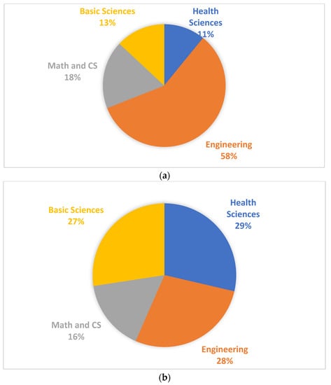 Among all the male students who graduated in the STEM fields over the period of ten years showed that a majority of them, about 58%, was in Engineering followed by Mathematics and Computer Science, Basic Science, and Health Science with the lowest percentage (11%) (Figure 1a). However, the distribution of female students across the STEM fields was different from the male students. About 29% of female students graduated with a degree in Medical Sciences followed by Engineering (28%), basic Science (27%), and Mathematics and Computer Science (16%) (Figure 1b).