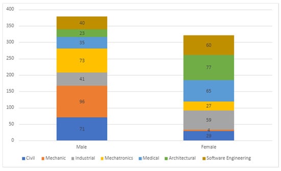 Data analysis also indicated that the most favored fields of Engineering by females were Architectural engineering (77% compared to 23% of males), Medical engineering (65% compared to 35% of males), Software engineering (60% compared to 40% of males), and Industrial engineering (59% comparing to 41% of males). However, males favored mostly Mechanical engineering (96% compared to 4% of females), Civil engineering (71% compared to 29% of females), and Mechatronics engineering (73% compared to 27% of females). See Figure 2 below: