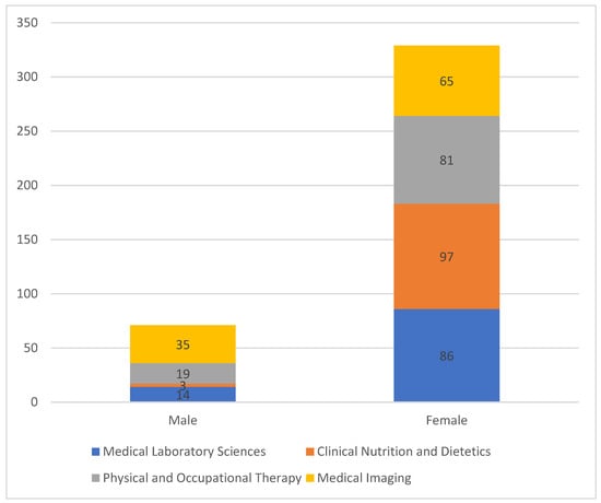 Data also revealed that the most favored fields of Health Sciences by females were Clinical Nutrition and Dietetics (97%), Medical Laboratory Sciences (86%), Physical and Occupational Therapy (81%), and Medical Imaging (65%). However only 35% of male graduates were in favor of studying Medical Imaging, 19% favored Physical and Occupational Therapy, 14% favored Medical Laboratory Sciences, and only 3% studied Clinical Nutrition and Dietetics (Figure 3).