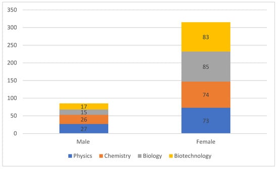 Concerning basic Sciences, results showed that females dominantly favored those fields. As shown in Figure 4, 83% and 85% of females studied Biotechnology and Biology followed by 74% and 73% studied Chemistry and Physics. On the contrary, Chemistry was the highest favored science by males (26%) followed by only 17% of males studying Biotechnology and only 15% of male graduates studied Biology.