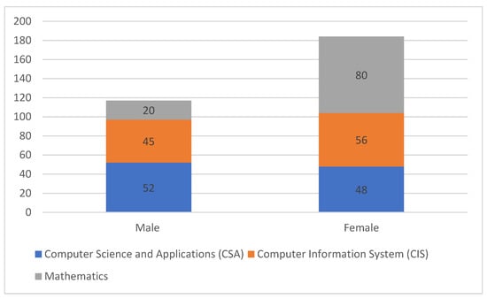 Similarly, Computer Sciences and Mathematics were mostly studied by female graduates. As shown in Figure 5 below, (80%) of females studied Mathematics compared to only 20% of male graduates. Likewise, Computer Information Systems (CIS) was also favored by female students (56%) compared to (45%) of males who studied that subject. However, Computer Science and Application seemed to be favored by both male and female students with a percentage of (52% and 48%) respectively.