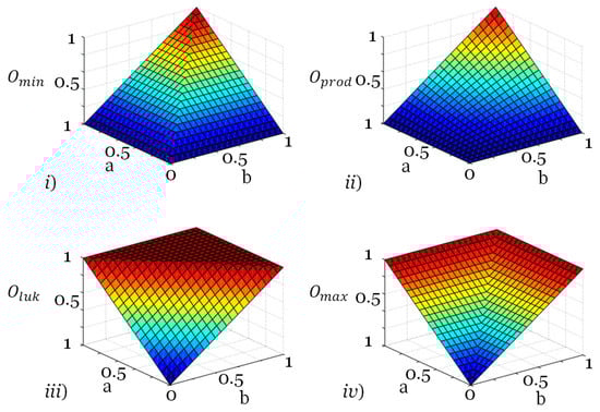 The main fuzzy logic operators include (Figure 2): minimum, given by , which results in the lowest membership among those evaluated; product, given by , which results from the multiplication of the assessed membership; Lukasiewicz, given by , which results from an arithmetic operation between the assessed membership; and maximum, given by , which results in the highest membership among those evaluated [51].