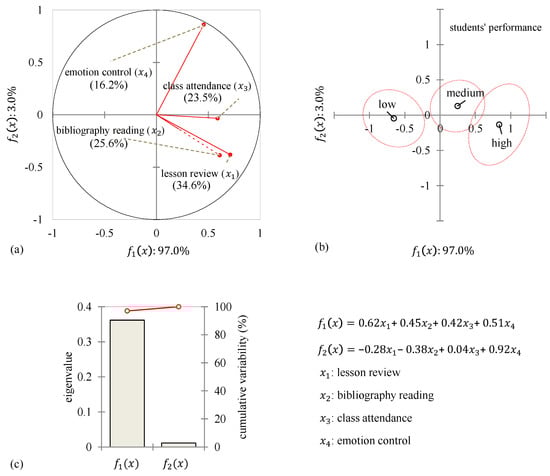 Importance of each learning strategy for student performance and risk retention: (a) scoring plot, (b) loading plot, and (c) importance explained.