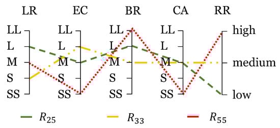 Parallel coordinates plot of the rules (, and ): LR—lesson review; EC—emotion control; BR—bibliography reading; CA—class attendance; RR—retention risk; SS—very small; S—small; M—medium; L—large; and LL—very large.