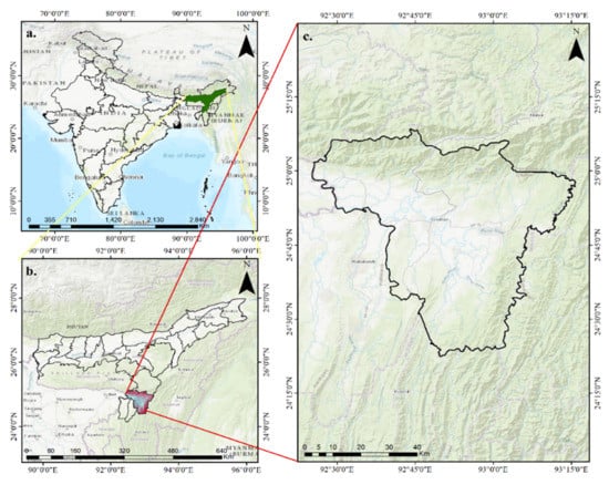 Study area: (a) India, (b) Assam, and (c) Cachar.