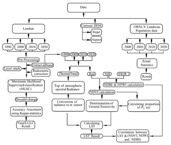 Flow chart of methodology for LULC, LST, and population density analysis.