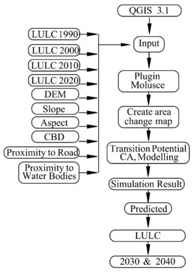 LULC and other thematic maps were prepared using ArcGIS 8.1, whereas projection for the year 2030 and 2040 were done using the MOLUSCE plugin in QGIS 3.1, as shown in (Figure 3).