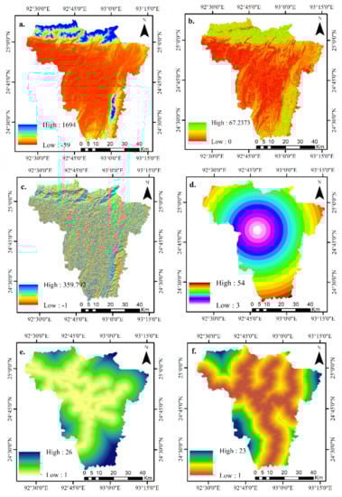 (a) DEM, (b) Slope, (c) Aspect, (d) CBD, (e) Proximity to Water Bodies, (f) Proximity to Road.
