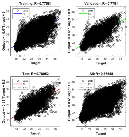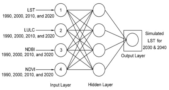 As an important part of the study, simulations were used to predict the temperature for the next two decades. There are many ways to predict simulated temperature, such as the MOLUSCE tool in QGIS, Artificial Neural Networks, hybrid neural models, Markov chain, regression models, etc. [51]. We simulated the LST for the years 2030 and 2040 using an ANN tool. The sample point for the ANN model was generated by dividing the research region into 300 m × 300 m spatial grids in QGIS. This grid size was determined by calculating the smallest area over which a single feature might significantly alter the LST [9]. In order to develop the prediction model, we used the land use land cover (LULC), normalised differential vegetation index (NDVI), normalised differential built-up index (NDBI), and land surface temperature (LST) of the years 1990, 2000, and 2010 as input parameters and LST for the year 2020 as target data and predicted the 2020 LST (Figure 5) [9,22,43]. We used the feed-forward backprop method as a network type, with a total of 10 neurons, and PURELIN as a transfer function to run the ANN model in MATLAB. Correlation coefficients were used to evaluate the accuracy of the model using Equation (24). We trained the model with accuracy for training: = 0.775, Validation: = 0.778, Test: = 0.780 and AII: = 0.776 (Figure 6). To simulate the LST for the years 2030 and 2040, we used the NDVI, NDWI, NDBI, and LST at an interval of 10 and 20 years and supplied them to the above trained model [52,53]. The final value ranges between 0.5 to 0.7, which shows strong positive correlation [54,55]. Pixel value data of the image were changed to discrete (point) data values using ArcGIS Version-10.6.1.